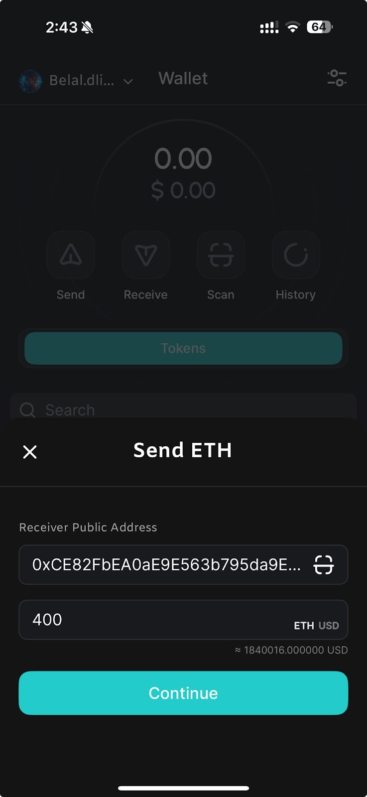 - Type in the Receiver’s Wallet Address or scan their QR code.